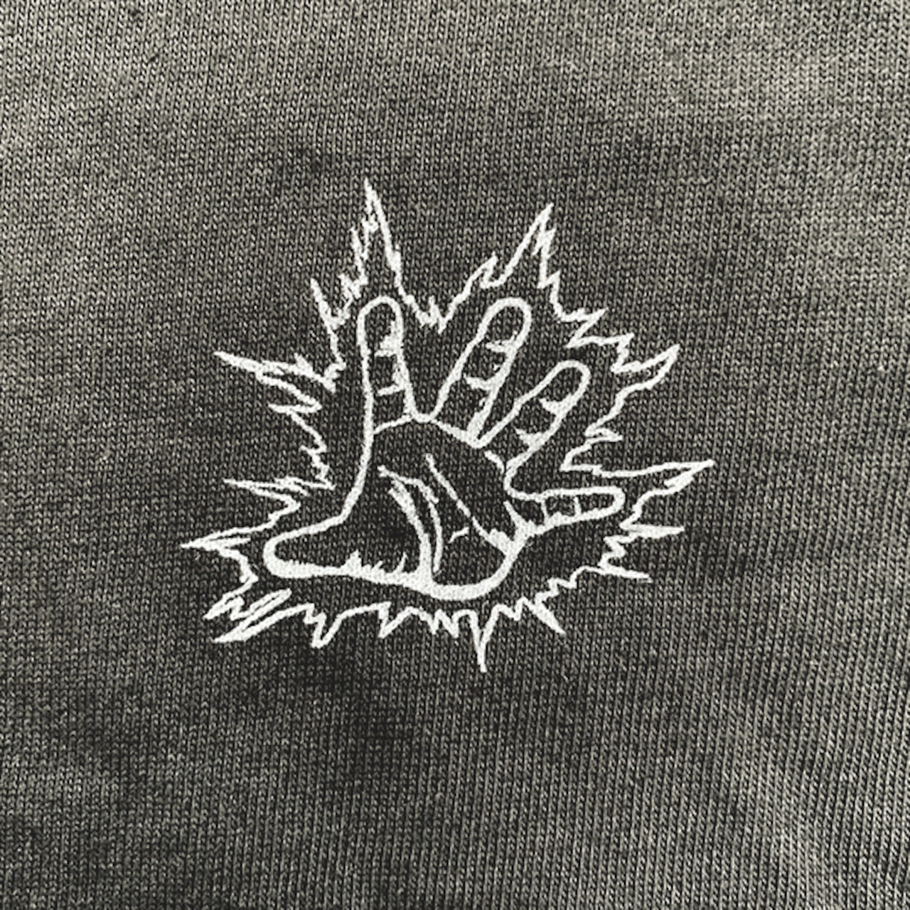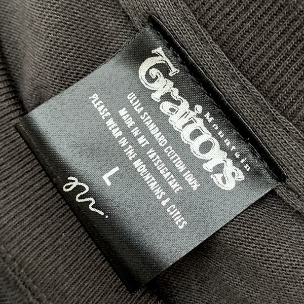 今回は敢えて古着のような洗いざらした印象にしたく、グラフィックのプリント仕様は、染み込み2回刷りにしてもらいましたのでパキッとした感じではないです。ボディも黒ではなくチャコール(赤みを帯びたダークグレーと言いましょうか)にしていますので、ディテールにこだわりのある方はお気をつけください。